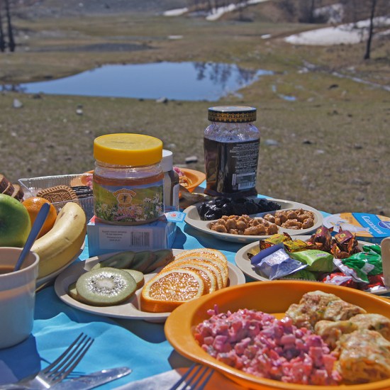 Today, we trek downhill to the Tsagan Gol valley. After our long trek, we’ll be welcomed by a nomadic Tuvan family. We’ll sample their dairy products, their special milk vodka distilled from yak milk, and peruse their wonderful felt crafts.