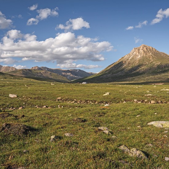 We cross the Altais at an elevation of 3600m. Here, we’ll enjoy broad views across the mountain range, including the Tsaagan Hairhan Uul – the “Sacred White Mountain” (elevation: 3662m). We arrive at the scenic Bear Valley, home to glacier-fed streams and rivers, forested hills, and wooded meadows. We will spend two nights here.